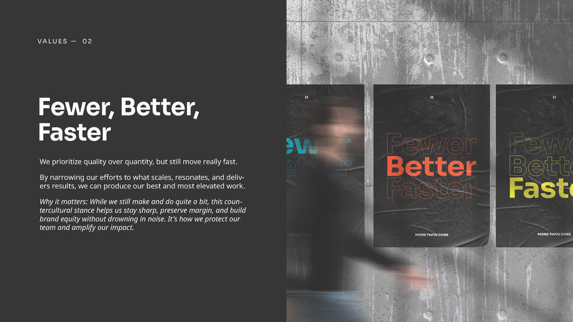 When ASOTU and Congruent came together, the goal wasn’t just to merge two brands — it was to create a shared identity that felt alive, ambitious, and unmistakably human. More Than Cars captures that evolution: a blend of craftsmanship and cutting-edge tech, told through a design language that’s both sophisticated and a little rebellious. It’s a reflection of a team in motion — growing fast, thinking boldly, and creating work that celebrates the art behind every idea.